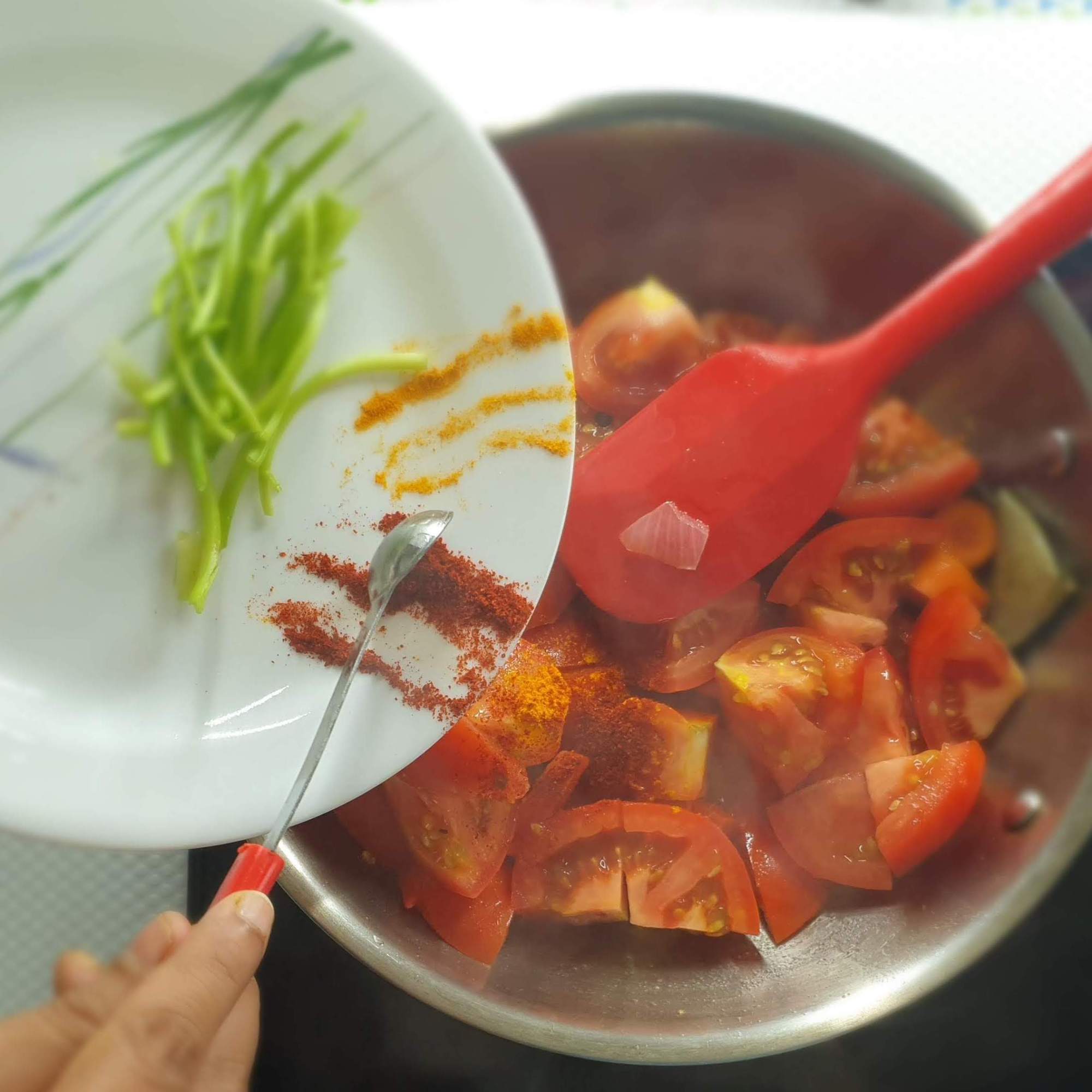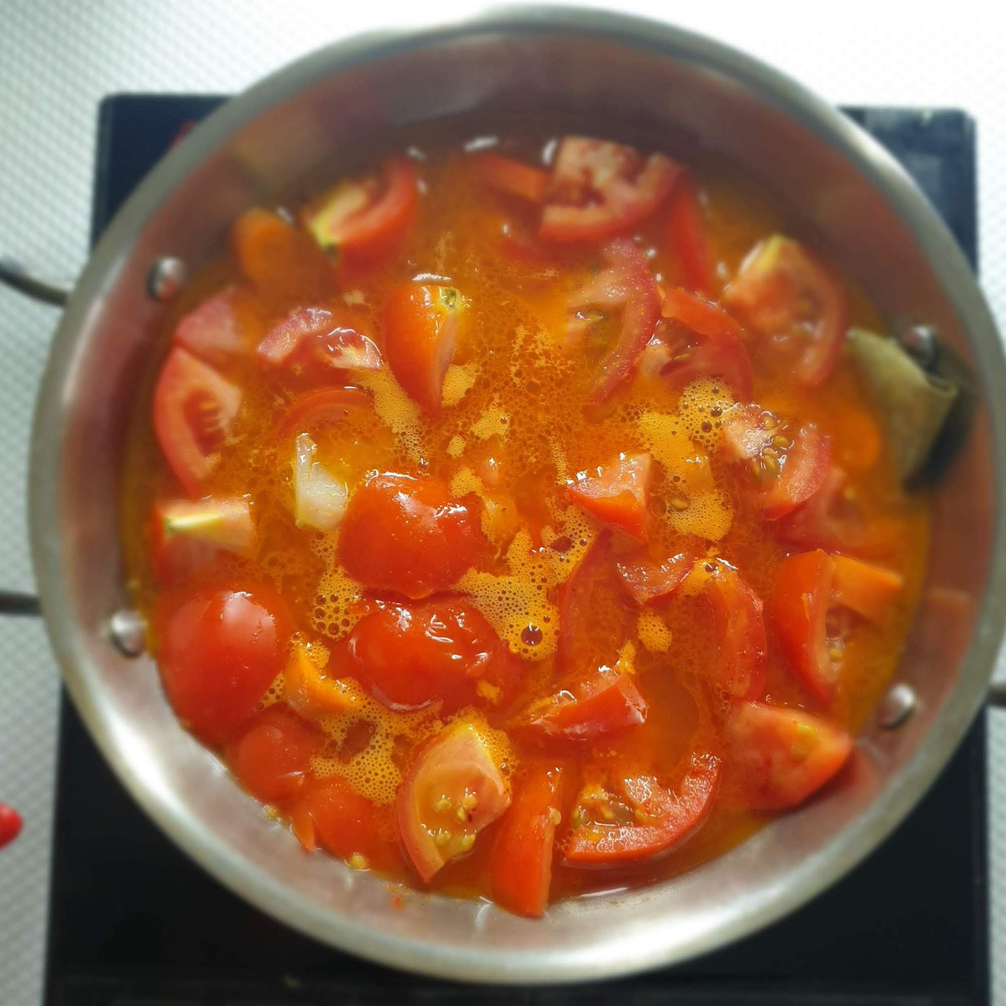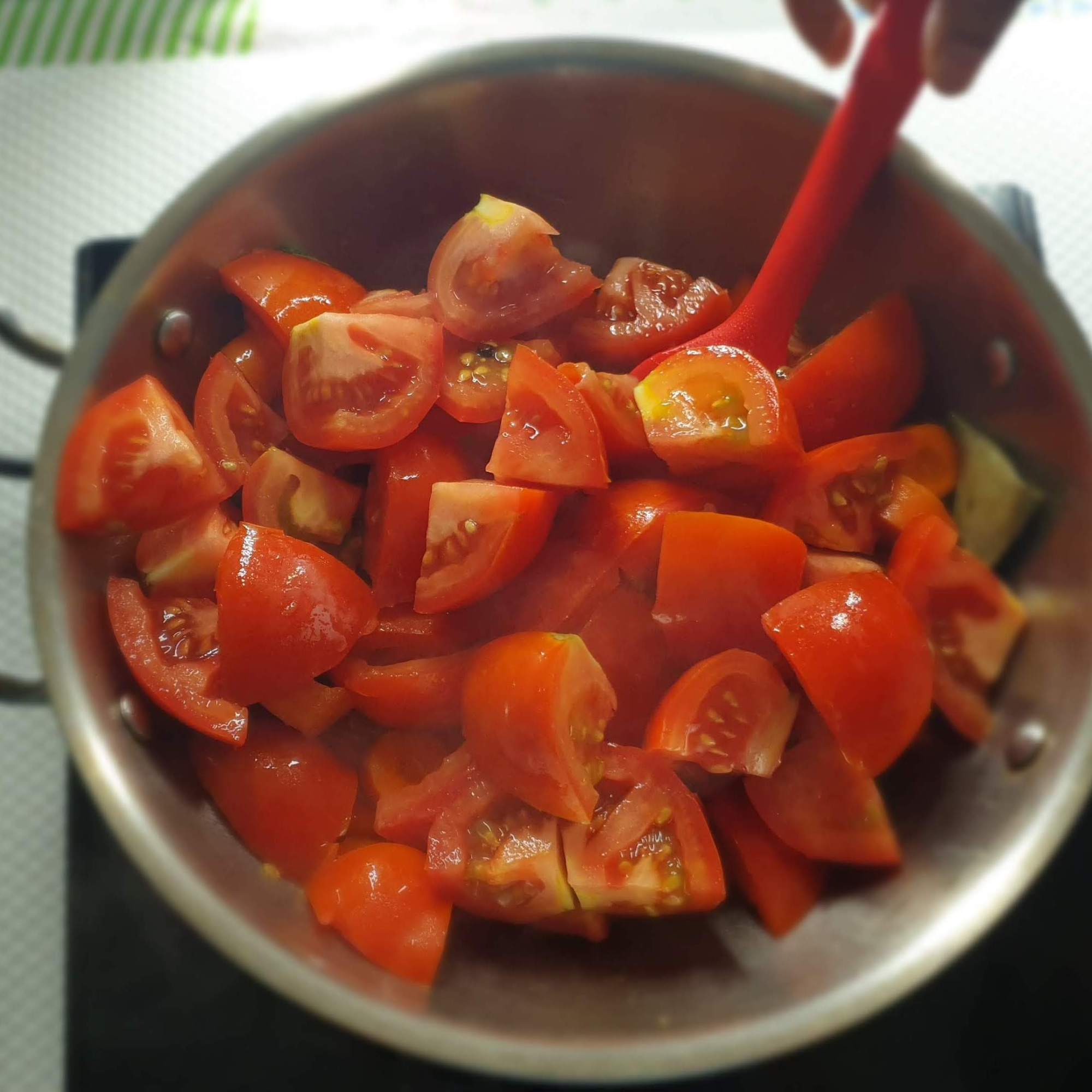 - Chop the tomatoes roughly (no specific size just cut into pieces ) .