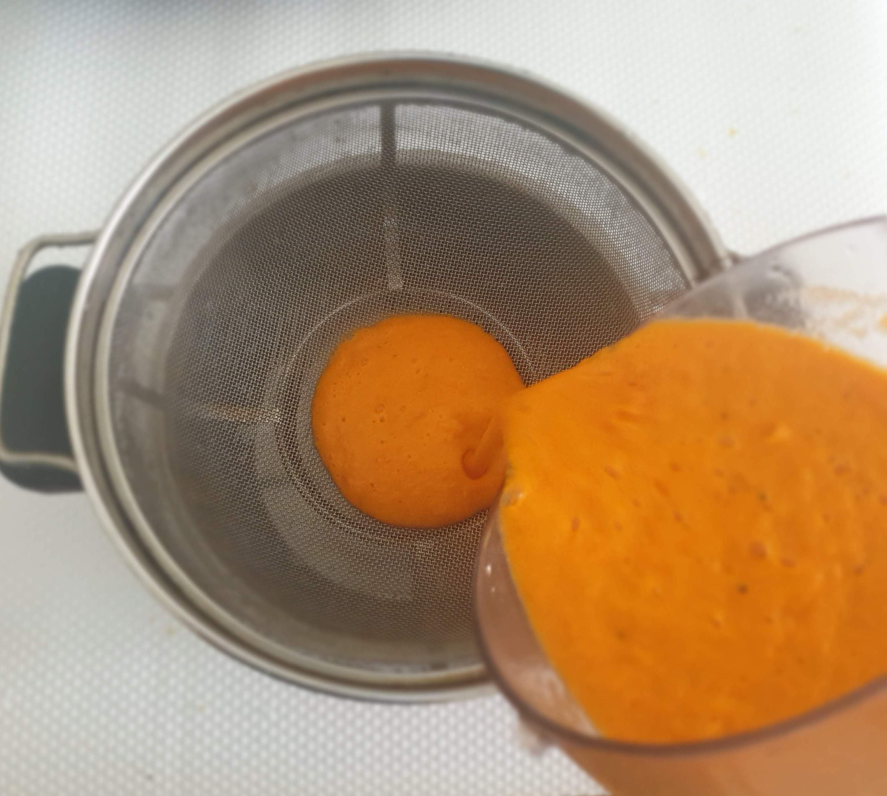 - Strain this puree through strainer so that seeds and skin of the tomatoes get removed and mixture will become smooth in texture.