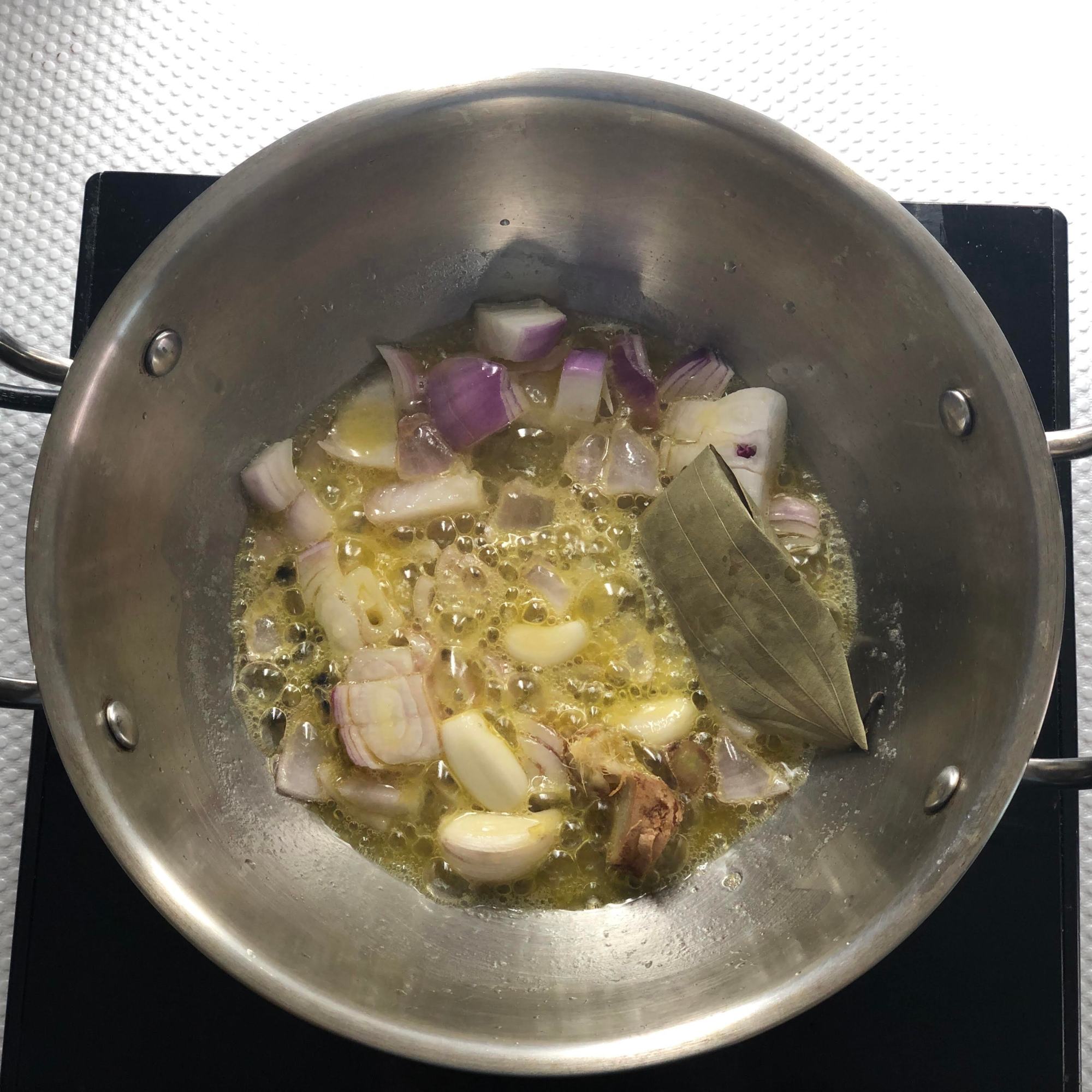 - Add bayleaf , black pepper corn , garlic cloves and ginger and saute .
