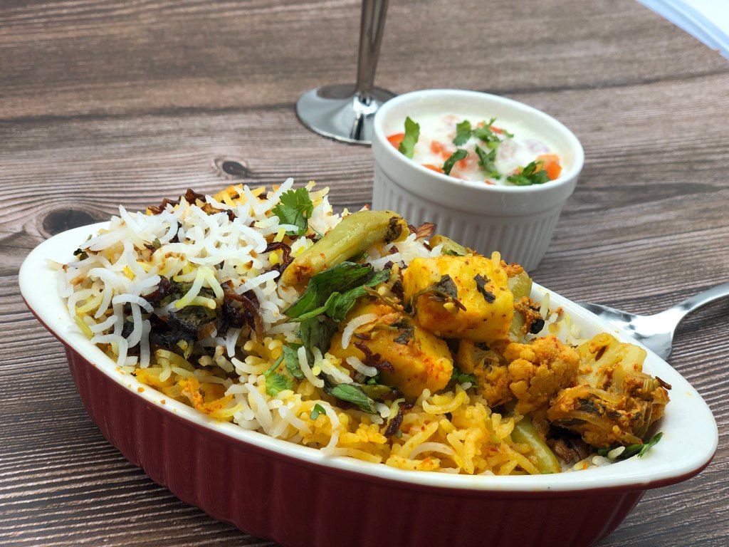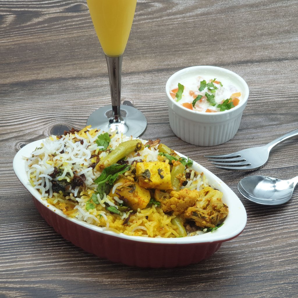 Veg Biryani is basically a flavourful rice (preferably basmati rice) cooked with Indian spices and vegetables. In Dum biryani vegetables and rice are layered on each other and cooked on very low flame. Dum is a slow cooking method. In this process the ingredients are enclosed in a Handi or thick base pot and the lid is sealed. This way it uses the steam to cook the ingredients and enhances flavours.