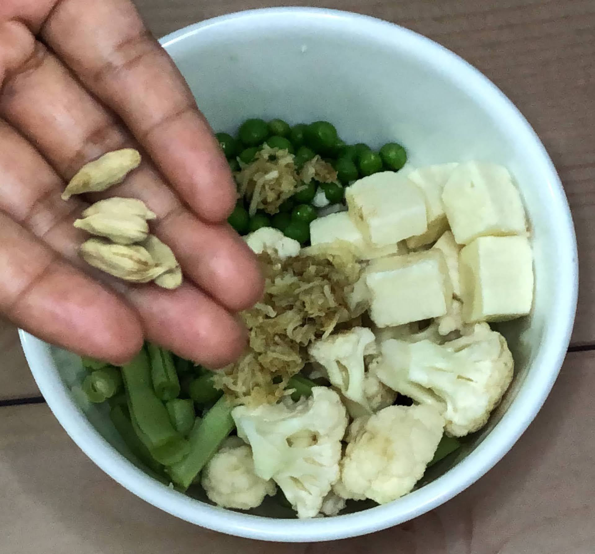 Note: Do not mix the ingredients. We have to layer first rice on the vegetables and then sprinkle other ingredients on top of rice.