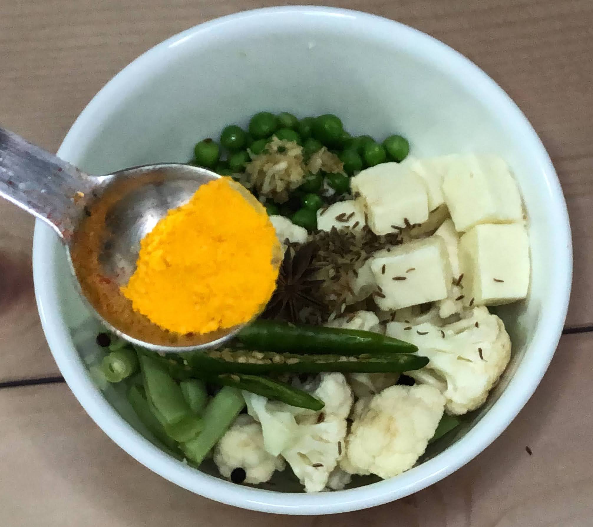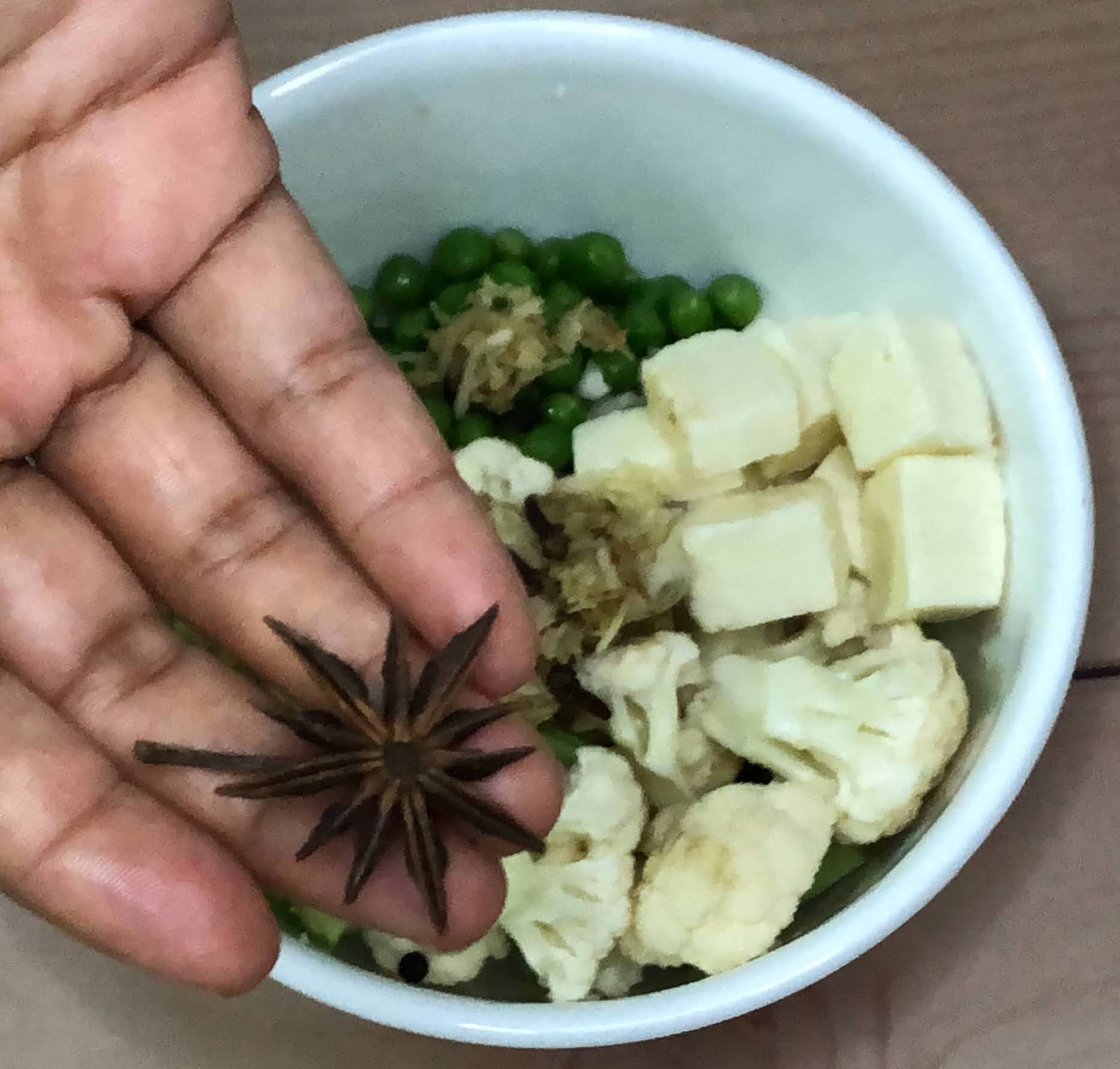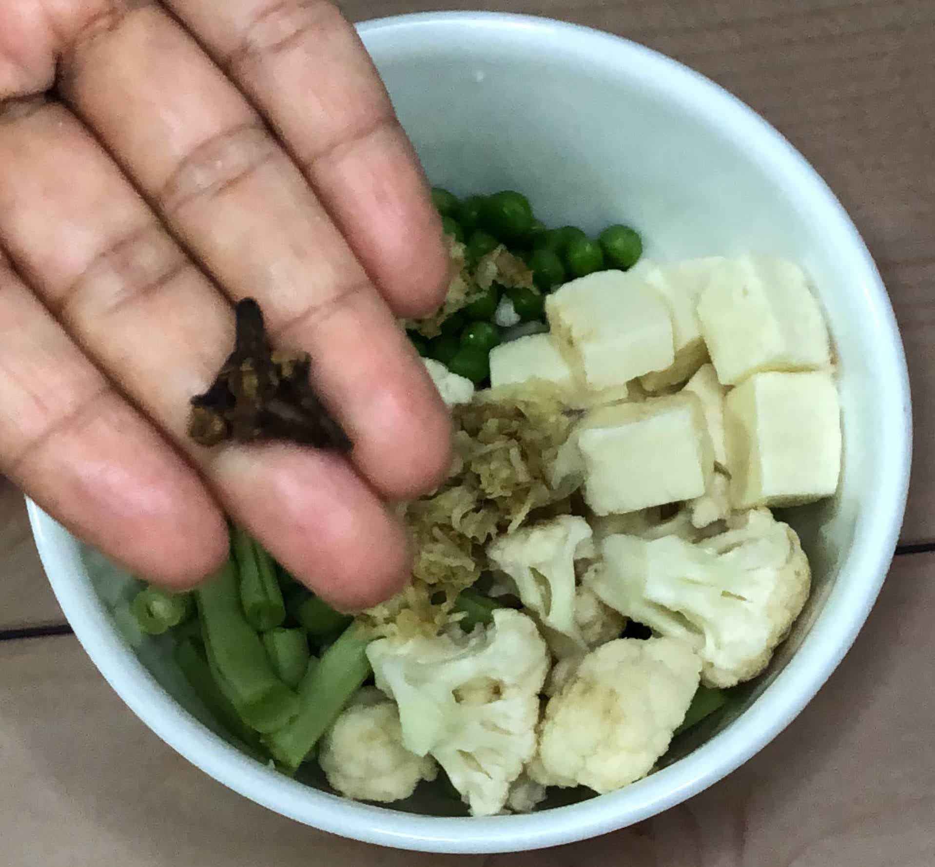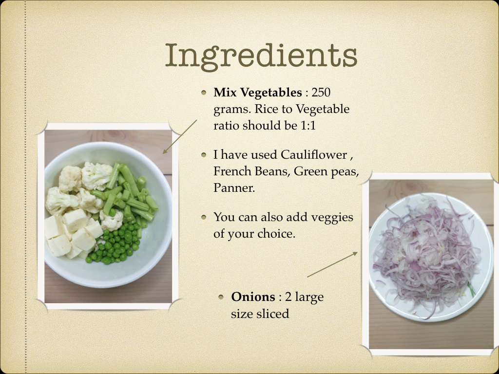 - Mix Vegetables : 250 grams. Rice to Vegetable ratio should be 1:1. I have used Cauliflower , French Beans, Green peas, Paneer. You can also add veggies of your choice.