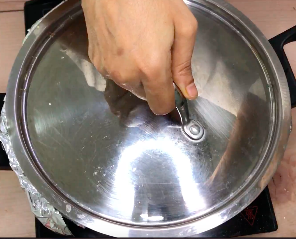- Cover the pot with aluminium foil so that steam won’t come out. (Or you can use wheat dough to seal the lid)