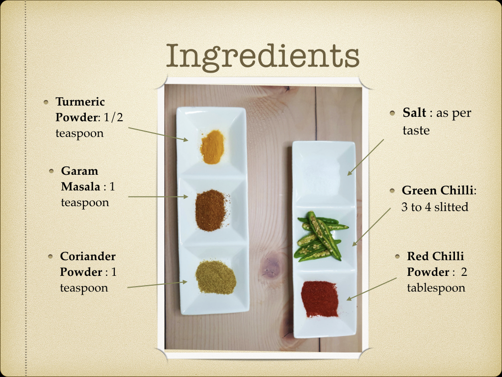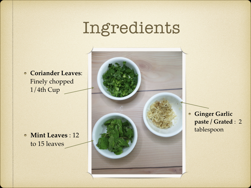 - Coriander Leaves: Finely chopped 1/4th Cup