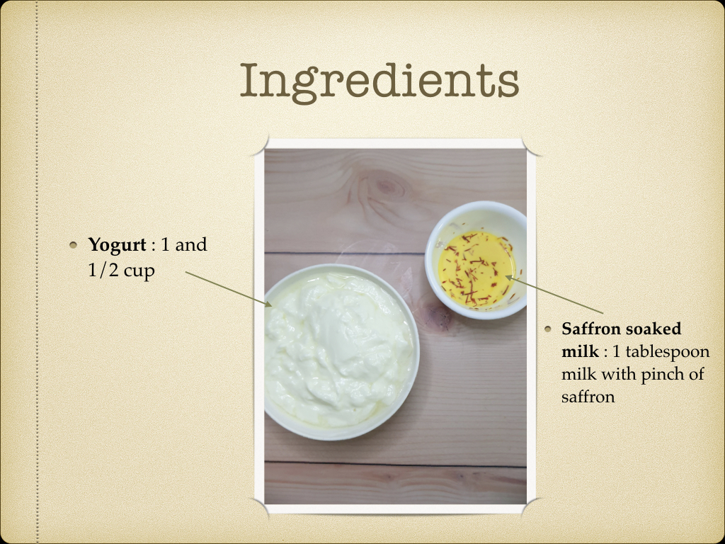 - Saffron soaked milk : 1 tablespoon milk with pinch of saffron